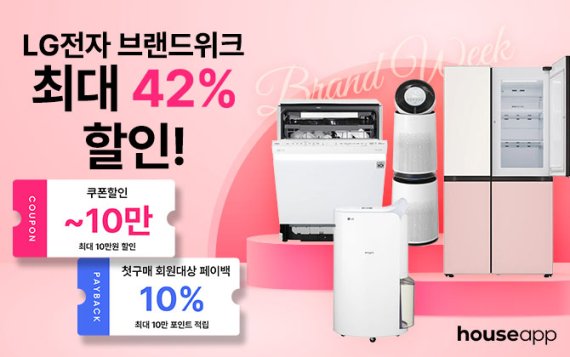 ▲하우스앱은 LG전자 공식 파트너사와 함께 브랜드위크를 21일까지 진행한다. 이번 행사는 하우스앱 기획전 내 LG 전 상품을 대상으로 실시된다. 10% 할인쿠폰, 10% 페이백, 신규가입쿠폰 등 다양한 할인과 무료배송 혜택이 있다. LG전자 디오스 트루스팀 식기세척기 12인용이 37% 할인, 스타일러 S5MBAU 상품은 36% 할인, 디오스 오브제 컬렉션 양문형 냉장고는 31% 할인된 가격으로 만날 수 있다. 22년형 신모델 제습기, 퓨리케어 공기청정기, 세탁기, 노트북 등 모든 상품에 최대 42% 할인된다.