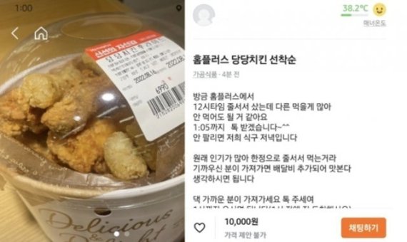 판매자는 당당치킨 사진을 올리고 "방금 12시 타임에 줄을 서서 샀다"며 "원래 인기가 많아 한정으로 줄 서서 먹는 거라 가까우신 분이 가져가면 배달비 추가해 맛본다고 생각하시면 된다"고 적었다.