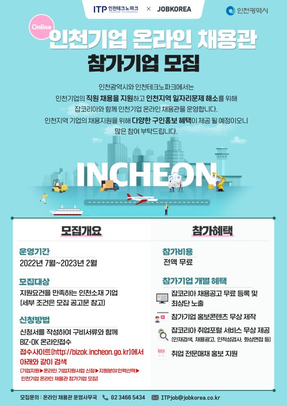 인천테크노파크(인천TP)와 인천시는 온라인 리쿠르팅 정보제공사인 잡코리아와 함께 내년 2월까지 '인천기업 온라인 채용관'을 운영한다고 18일 밝혔다.