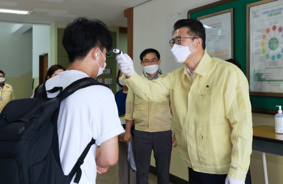 이번 방문은 개학 전후 학교의 방역 준비상황을 점검하고, 최근 호우로 피해를 입은 학교의 복구를 위해 필요 사항 등 현장 의견을 듣기 위해 마련됐다.