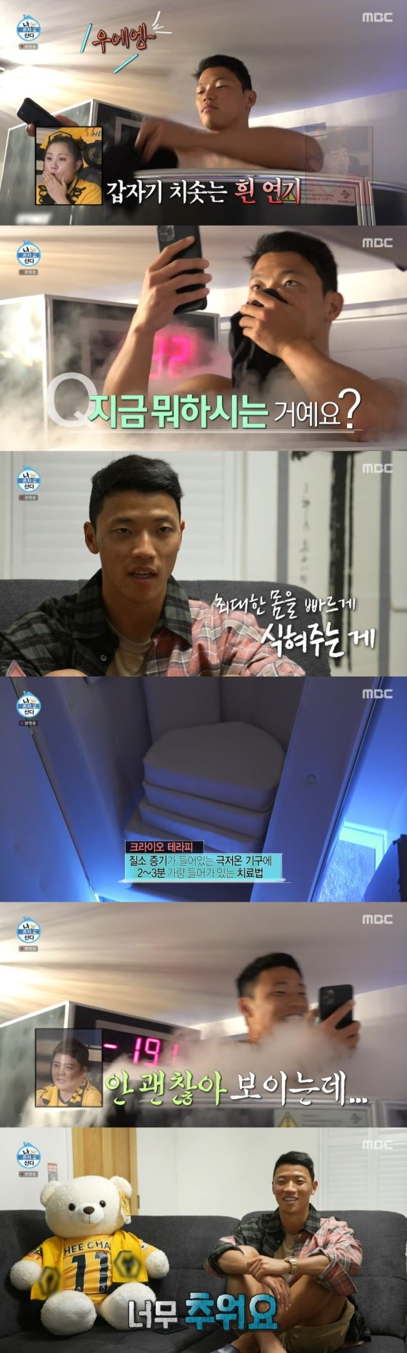 황희찬은 "운동을 한 뒤 최대한 몸을 빠르게 식혀 주는 게 가장 좋은 방법인데, 크라이오 테라피는 3분동안 -190도까지 내려가서 몸을 빠르게 회복시켜 준다"라고 설명했다.