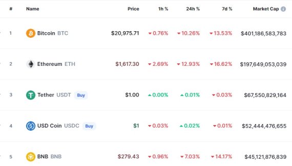 비트코인은 20일 오전 8시 10분 현재(한국시간 기준) 글로벌 코인시황 중계사이트인 코인마켓캡에서 24시간 전보다 10.26% 폭락한 2만975달러를 기록하고 있다. 비트코인이 2만1000달러를 하회한 것은 지난 7월 27일 이후 처음이다.