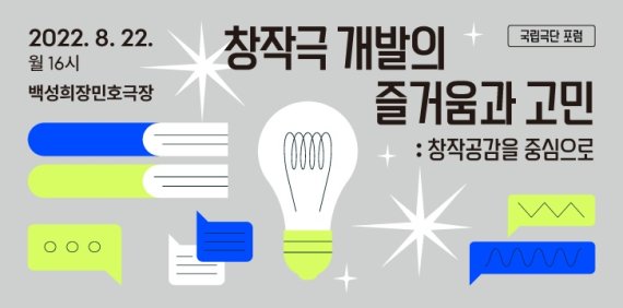 이번 포럼에선 '창작공감' 사업을 중심으로 극단 창작극 개발 사례와 고민을 공유하고, 앞으로의 발전 방향을 논의한다. 발제는 국립극단 작품개발팀장 정용성, '창작공감' 운영위원 전영지, 전강희, 이경미 등 4명이 국립극단 창작극 개발 역사와 '창작공감' 운영과정을 주제로 진행한다.