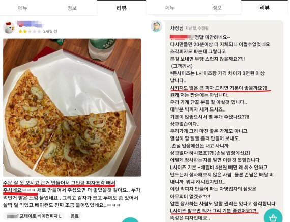 누리꾼들은 "뺄 순 있지만 구구절절 답변 다는 거 보니 장사 망해도 할 말 없겠다", "실수로 만든 거면 다시 만들어 보내야 하는 거 아니냐", "큰 피자 보내고 다음에 또 시켜달라고 하면 단골 됐을 것", "대처가 너무 뻔뻔하다", "나 같으면 별 1개 주거나 환불했다" 등 공분했다.