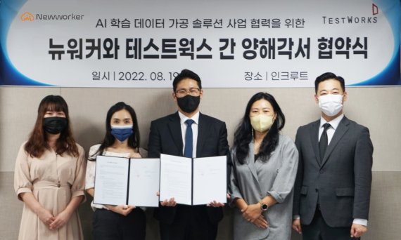 [서울=뉴시스]동효정 기자 = 긱 워커(초단기 노동자) 플랫폼 뉴워커는 인공지능(AI) 데이터 및 검증 전문기업인 테스트웍스와 업무협약을 맺었다고 22일 밝혔다.