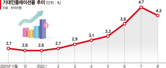 기대인플레이션율이 하락한 것은 지난해 12월 0.1%p 하락한 이후 8개월 만에 처음이다. 특히 7월 기대인플레이션율은 2008년 관련 통계가 시작된 이래 최고치를 찍은 바 있다.