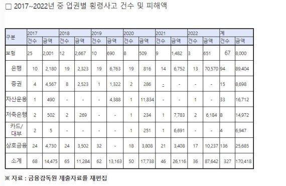 개별 금융사로는 하나은행과 단위농협, 신협이 2017년부터 올해까지 한해도 거르지 않고 6년 연속 횡령사고가 발생하면서 각각 17회, 59회, 58회 발생했다. 우리은행도 최근 2019년부터 올해까지 4년 연속 발생했다. 보험사 중에선 유일하게 삼성생명이 4년간 횡령사고가 발생했고, 국민은행과 KB손해도 3회 발생한 것으로 나타났다.