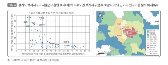 하남시나 고양시 택지지구의 경우 전체 유입인구 중 서울시로부터 이동한 인구의 비중이 다른 지역에 비해 높았지만, 오산·화성·평택시 등 서울로부터 거리가 멀어질수록 서울로부터의 인구유입 비중은 급격히 떨어졌다.