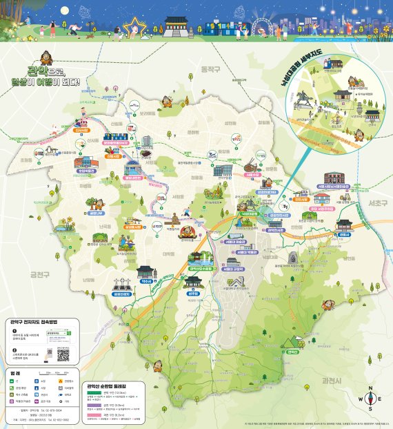 지도에는 관악산, 낙성대공원, 별빛내린천, 문화플랫폼 S1472, 서울대 규장각과 같은 주요 관광명소와 관악구청, 도시농업센터, 유아숲체험장 등 공공기관과 주민편의시설 등을 중심으로 관악구 전 지역이 담겨져 있다.