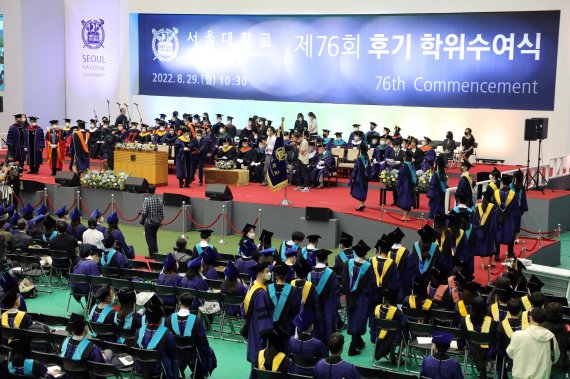 서울대학교는 이날 오전 10시30분쯤 관악캠퍼스 종합체육관에서 '제76회 후기 학위수여식'을 진행했다. 이번 학위수여식에서는 학사 959명, 석사 1041명, 박사700명 등 총 2700명에게 학위가 수여됐다.