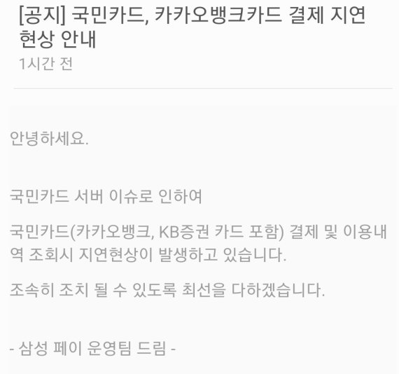 삼성페이 측은 이날 오후 12시20분 공지사항을 올리고 "국민카드 서버 이슈로 인해 카카오뱅크와 KB증권을 포함한 국민카드 결제 및 이용내역 조회시 지연현상이 발생하고 있다"고 말했다.