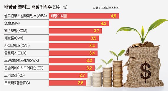 크레디트스위스는 배당을 꾸준히 지급해온 배당귀족주 10개 종목을 추천했다. △월그린부츠얼라이언스 △3M △엑손모빌 △셰브론 △카디날헬스 △클로록스 △스탠리블랙&덱커 △콘솔리데이티드에디슨 △코카콜라 △프록터&갬블 등이다.