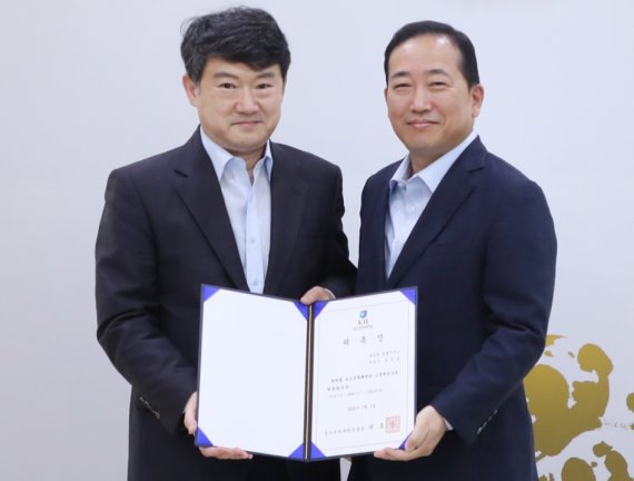 금오공대 고문변호사로 위촉된 유능종 변호사(왼쪽)가 곽호상 총장으로부터 위촉증을 받고 있다. 2022.8.31/뉴스1