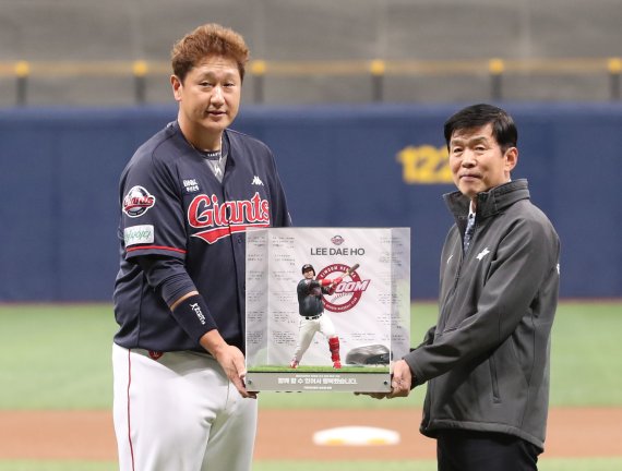 [서울=뉴시스] 조수정 기자 = 롯데 자이언츠 이대호가 31일 오후 서울 구로구 고척스카이돔에서 2022 KBO리그 롯데 자이언츠와 키움히어로즈 경기에 앞서 열린 다섯번째 은퇴투어에서 키움 히어로즈 위재민 대표이사로부터 '고척스카이돔X이대호 선수 피규어'를 전달받고 있다. 피규어는 22년간의 선수생활을 마무리하고 은퇴 투어 중인 이대호 선수의 업적을 기리기 위해 고척스카이돔에 선 이대호 선수를 형상화했다. 타격박스 모형의 피규어 받침대는 이 선수가 이곳에서 이룬 기록과 추억을 기억해주기를 희망해 실제 고척스카이돔 흙을 사용해 제작했고 배경은 이 선수를 향한 선수들의 메시지로 장식했다. 2022.08.31. chocrystal@newsis.com [서울=뉴시스]김주희 기자 = 키움 히어로즈가 이대호(롯데 자이언츠)의 작별 선물로 피규어를 건넸다.