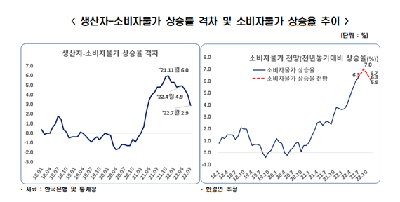 한경연 보고서에 따르면 3개월전인 지난 4월 생산자·소비자물가 간 이격률은 4.9%포인트(p)에 달했으나, 3개월만인 7월 중 2.9%p로 줄어들었다. 한경연은 주된 인플레이션 파급경로로 지목됐던 △국제원자재 가격 고공행진 △생산자물가 상승 △소비자물가 상승의 흐름이 완화될 조짐을 보이고 있다고 해석했다.