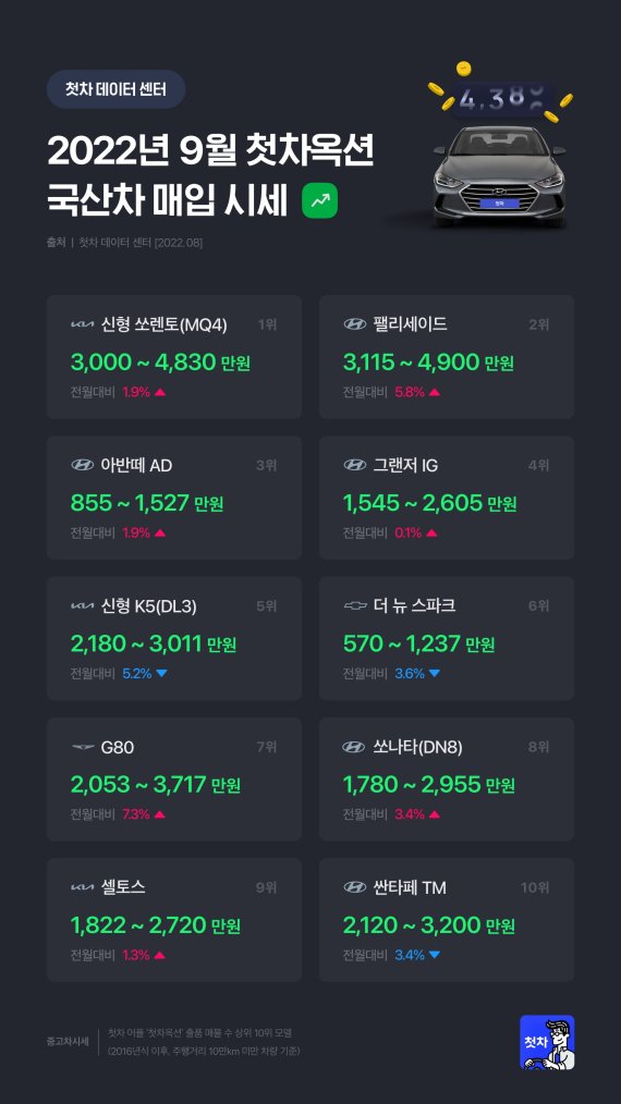 [서울=뉴시스]안경무 기자 = 모바일 중고차 플랫폼 첫차는 9월 국산 중고차 매입 가격이 상승 곡선을 그릴 것이라고 내다봤다. 특히 쏘렌토와 팰리세이드 같은 대형 SUV가 인기를 끌 것이라고 관측했다.