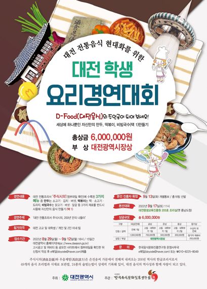 지용환 대전시 보건복지국장은 “지역의 전통요리 방식이 학생들의 창의적이고 톡톡 튀는 아이디어로 현대인의 입맛에 맞게 새로운 음식으로 탄생하기를 기대한다”며 “앞으로도 다양한 음식문화 콘텐츠 개발로 지역식품산업 발전에 최선을 다하겠다”고 말했다.