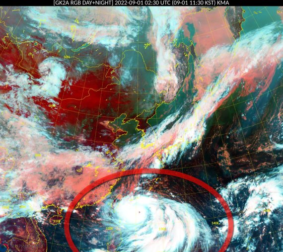 힌남노는 2일 오전 9시 기준 대만 타이베이 남동쪽 560㎞ 해상에서 시속 2㎞의 느린 속도로 북북서진하고 있다. 중심기압은 935hPa 최대풍속은 초속 49m다.