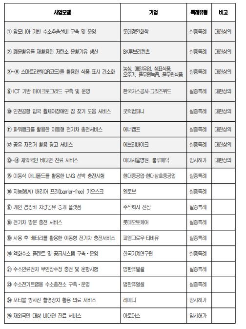 이들은 ▲암모니아 기반 수소추출설비 구축 및 운영, 폐윤활유를 재활용한 저탄소 윤활기유 생산 ▲스마트라벨(QR코드)을 활용한 식품 표시 간소화 ▲ICT 기반 마이크로그리드 구축 및 운영을 승인했다.