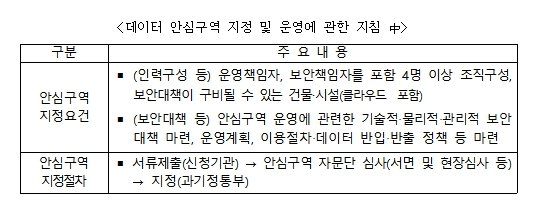 아울러 올해부터 새롭게 시행되는 제도인만큼 신청을 희망하는 기관을 대상으로 지정심사 절차, 작성 서류 및 유의 사항 등을 안내하는 '데이터안심구역 지정 제도 설명회'를 오는 21일 오후 2시 대한상공회의소에서 실시할 계획이다.