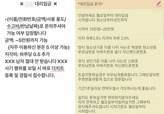 고등학생 B양은 "불법인 걸 알면서도 돈이 바로 들어오는 곳이 여기(대리입금) 뿐이니까 알면서도 빌렸다"며 "이자율을 '선제시' 받는 곳도 많다. 이자가 원금의 30%에 못 미치면 메시지를 읽지도 않는다"고 설명했다.