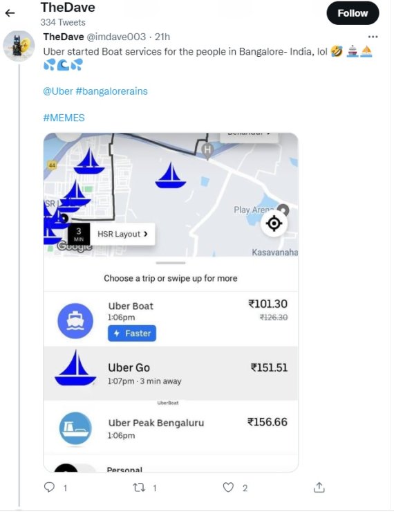 한 트위터 이용자는 우버앱 예약 페이지에 자동차 대신 보트를 집어넣어 "우버가 벵갈루루에 보트 공유 서비스를 제공하기 시작했다"라는 글을 올렸으며, 다른 여성은 "집 앞에서 이색 휴가를 떠날 수 있게 됐다"라며 사람들을 구조하러 다니는 구명보트의 모습을 공유했다. 벵갈루루 지역 신문은 "공짜로 집 안에 풀장이 생겼다"라는 코멘트와 함께 흙탕물이 가득 찬 거실의 모습을 업로드하기도 했다.