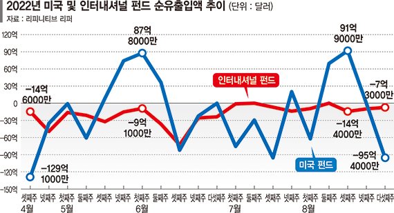 미국을 제외한 인터내셔널(해외)주식 펀드에서는 20주 연속 자금이 빠져나갔다. 2019년 10월 이후 최장기간 순유출이다.