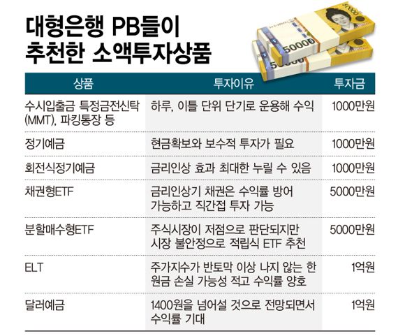 수중에 있는 돈이 5000만원 정도라면 일부는 현금이나 수시입출식 상품, 정기예금에 넣어두고 나머지를 채권형 상장지수펀드(ETF)나 분할매수형 ETF를 선택할 수 있다는 조언이 많았다.