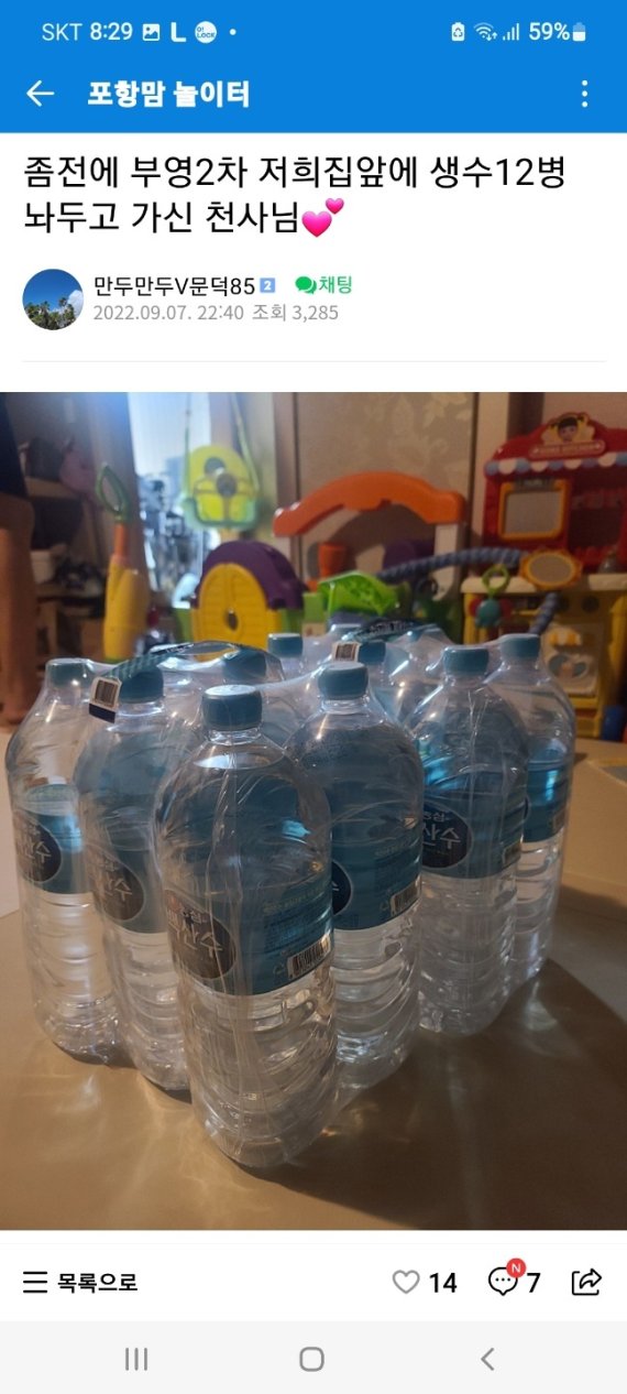 한 누리꾼은 생수 사진과 함께 '좀 전에 부영2차 저희 집 앞에 생수 12병 놔두고 가신 천사님'이라는 글을 올려 익명의 기부천사에게 고마움을 전했다.