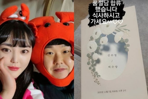 김수영은 8일 인스타그램 스토리에 청첩장을 공개했다. "품절남 합류했다"며 "식사하고 가세요"라고 남겼다. 11월5일 오후 2시 여의도 KBS홀에서 허수양(27)씨와 결혼식을 올릴 예정이다. 허씨는 8세 연하 동물병원 동물보건사다.