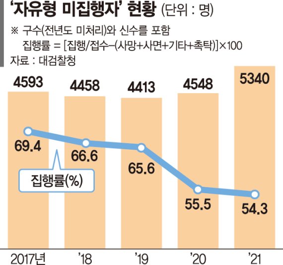 8일 대검찰청에 따르면 자유형 미집행자는 지난해 2021년 5340명으로 전년도 4548명에 비해 17.4% 늘었다. 그간 자유형 미집행자 규모를 보면 지난 2017년 4593명을 나타낸 이후 2020년까지는 4500명 수준에 머물러 있었다. 반대로 자유형 미집행자 검거를 통한 형집행률은 감소 중이다. 형집행률을 보면 △2017년 69.4% △2018년 66.6% △2019년 65.6% △2020년 55.5% △2021년 54.3%를 나타냈다.