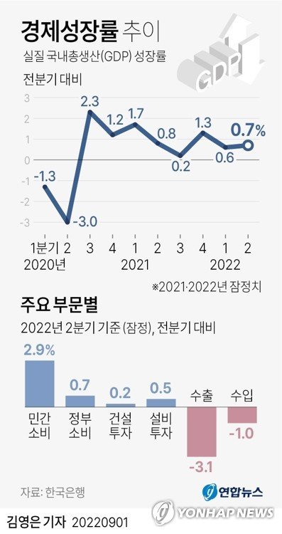 성장 뒷걸음은 앞으로가 더 걱정이다. 현대경제연구원은 이날 선진국의 경기하강 신호가 뚜렷해졌다며 "올해 하반기, 내년 상반기 중으로 세계 경제가 침체국면으로 진입할 것"이라는 보고서를 냈다. 현대경제연구원은 글로벌 경제 5대 리스크도 제시했다. 경기침체, 교역전쟁, 오일쇼크, 러시아 공습, 긴축 통화가 그에 해당한다. 전적으로 수출 중심의 경제구조인 우리나라는 이들 리스크에 극도로 취약하다.