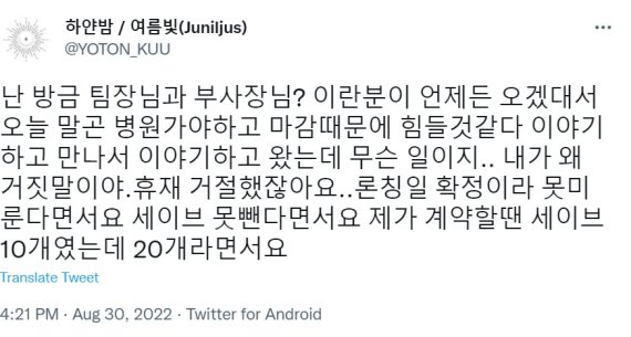 (서울=뉴스1) 권진영 기자 = "세이브원고 2~3개라도 덜 푸는 걸 간곡히 부탁드렸는데도 안 된다셔서 그날 전후로 하혈하며 원고를 했는데."