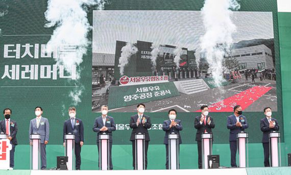 서울우유협동조합은 14일 서울우유 야외 행사장에서 양주 신공장 준공식을 열었다. 서울우유협동조합 문진섭 조합장과 임직원들을 비롯해 이한규 경기도 행정2부지사, 강수현 양주시장 등 약 1,500여 명이 참석한 가운데 양주 신공장 준공을 축하하며 터치버튼을 누르는 퍼포먼스를 하고 있다. 사진=서울우유협동조합 제공