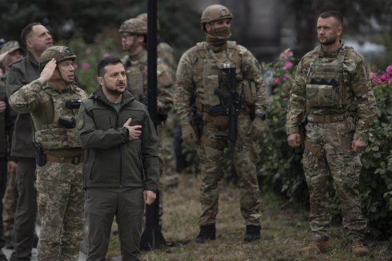 젤렌스키 대통령은 시커멓게 불에 탄 이지움 시청앞에서 병사들과 함께 우크라이나 국가를 부르며 국기가 올라가는 것을 지켜보았다. 거의 6개월간 러시아에 점령당했던 이지움은 아파트건물이 불에 타 검게 그을리고 건물마다 포격전의 흔적들이 패여 있는 등 황폐한 모습이다.