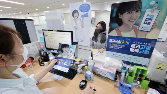안심전환대출 신청 시작일인 15일 서울 중구 한국주택금융공사 서울중부지사 상담창구에 '안심전환대출' 안내 포스터가 붙어 있다.