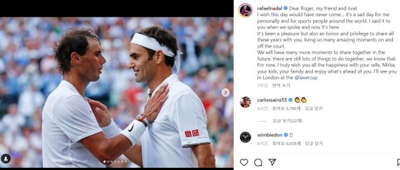나달은 16일(한국시간) 소셜네트워크서비스(SNS)에서 페더러에게 "나의 친구이자 라이벌"이라며 "이런 날이 오지 않았으면 했다. 개인적으로나 세계 스포츠인들에게 슬픈 날"이라고 은퇴에 대한 아쉬움을 전했다.