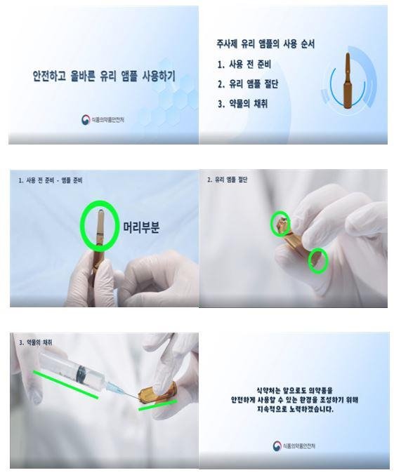 (서울=연합뉴스) 김잔디 기자 = 식품의약품안전처는 의료 전문가가 올바른 주사제 유리 앰풀(ampoule) 사용법을 쉽게 이해할 수 있도록 제작한 '주사제 유리 앰풀 안전 사용 정보 영상'을 16일 식약처 유튜브 계정 등에 공개했다고 밝혔다.