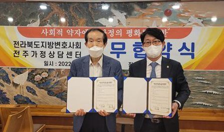 홍요셉 전북변호사회장은 "두 기관이 머리를 맞대 도내 위기 가정에 힘이 되려고 한다"며 "가정 문제와 관련한 보다 전문적인 사법 서비스를 위해서는 전주가정법원 설치도 꼭 필요하다"고 강조했다.