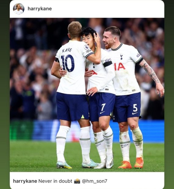 해리 케인은 경기 후 소셜네트워크서비스(SNS)를 통해 손흥민과 포옹한 사진을 게재한 뒤 "널 의심한 적 없었다"며 신뢰를 나타냈다.