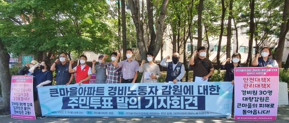 대전 아파트 경비노동자 권리찾기 사업단(이하 사업단)은 19일 오후 2시 대전 서구 한 아파트 정문에서 ‘경비노동자 감원에 대한 주민투표 발의 기자회견’을 가졌다.