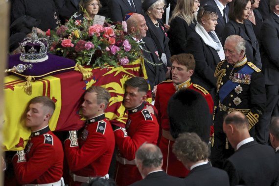 찰스 3세 새 국왕 등 왕실 가족들, 운구 행렬 뒤따라 행진