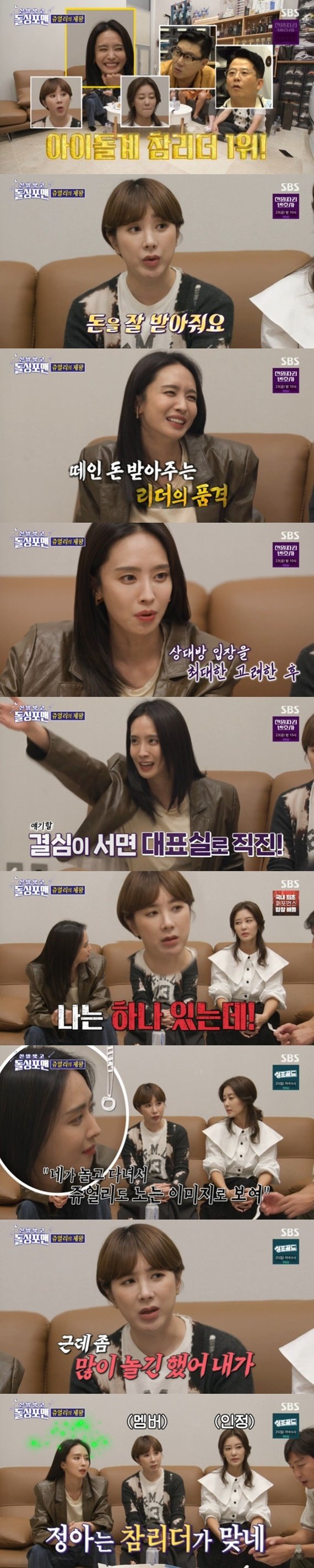 쥬얼리 리더 박정아가 연예계 참리더 1위로 소개돼 눈길을 끌었다. 이에 서인영이 박정아의 리더십을 인정하며 "돈 잘 받아준다, 참을 땐 참다가 한 번에 딱 얘기한다"라고 부연해 모두를 놀라게 했다. 박정아는 "이 정도면 충분히 내가 사정을 이해해줬고, 우리가 한 것에 대해 무조건 받아야 한다고 결심이 서면 대표실로 치고 간다"라고 소신을 밝혔다.