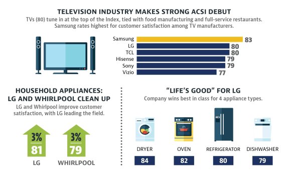 21일 미국 소비자만족지수협회(American Customer Satisfaction Index·ACSI)가 발간한 '2022년 소비자 만족도' 보고서에 따르면 삼성전자는 TV 부문에서 100점 만점에 83점으로, 가장 높은 점수를 획득했다. 이어 LG전자와 중국 TCL이 80점으로 동률을 이뤘다.