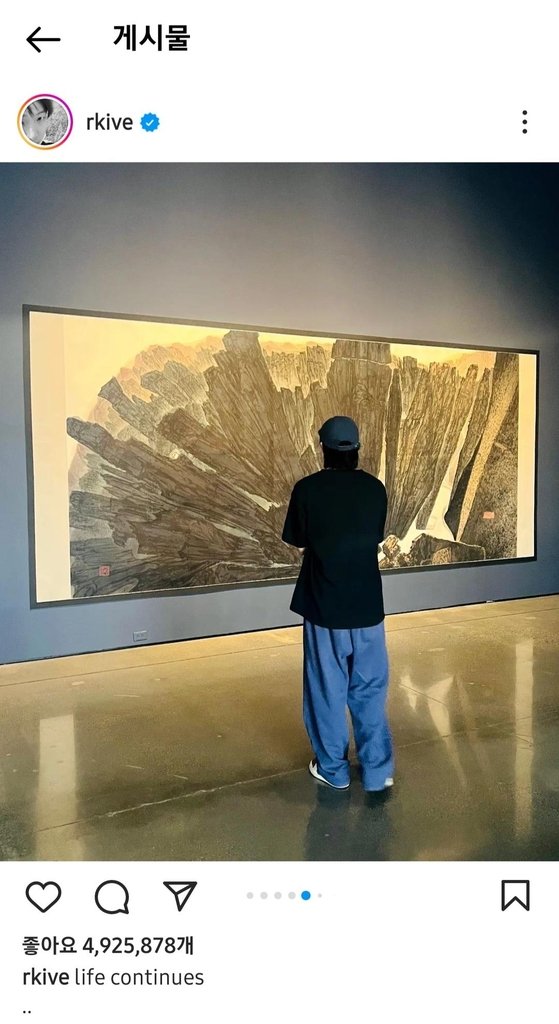 21일 경주엑스포대공원에 따르면 RM은 20일 밤늦게 인스타그램에 미국 로스앤젤레스 카운티 미술관(LACMA)에 전시 중인 박 화백 작품을 관람하는 자신의 뒷모습 사진을 올렸다.