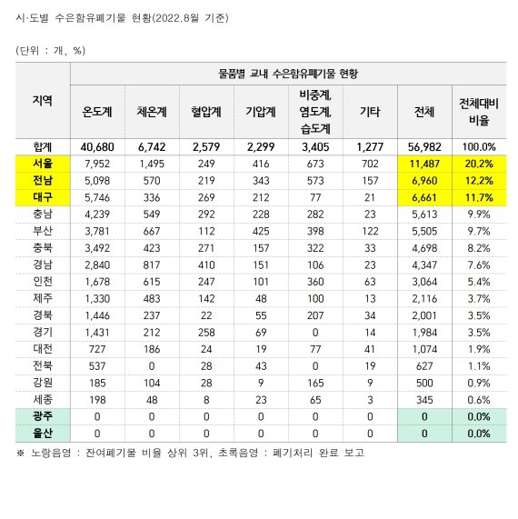 전국 시·도교육청이 도종환 의원에게 제출한 수은함유폐기물 현황을 보면 학교급별로는 초등학교에 2만3951개(42.0%)가 남아있다. 그 중 경남·경북·대전·세종·충북은 유치원에도 온도계·체온계 등 수은함유 폐계측기기가 남아있다.