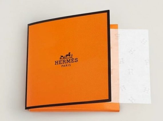 이 기름 종이는 에르메스의 상징인 주황색 상자에 담겨 한 장씩 뽑아 쓸 수 있게 제작됐다. 직사각형 모양의 기름 종이에는 에르메스의 알파벳 'H'가 배열돼 있는 모습이다.