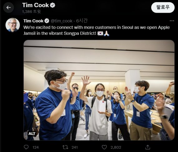팀 쿡 CEO는 이날 트위터에 글을 올려 “활기찬 송파구에 애플 잠실'을 개장했다”며 “서울의 더 많은 고객과 만날 수 있게 돼 기쁘다”고 밝혔다.