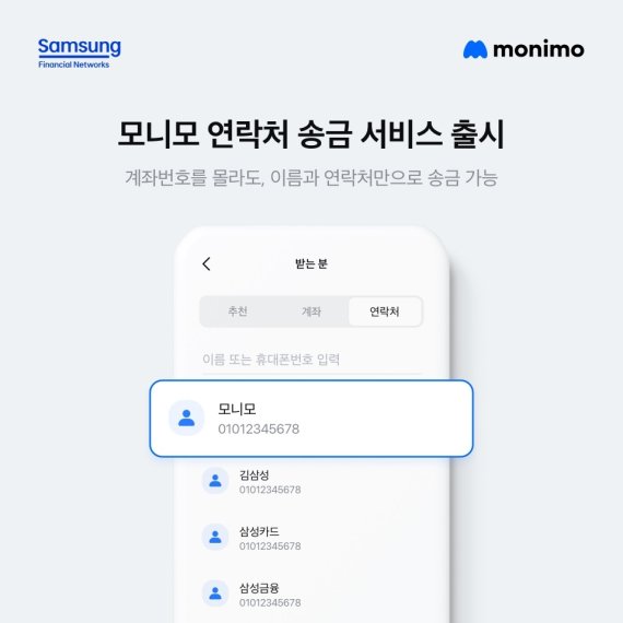 삼성카드 관계자는 "삼성금융네트웍스 통합앱 모니모 이용 고객의 편의성을 높이는 차원에서 '연락처 송금' 서비스를 출시했다"며 "앞으로도 다양한 생활금융 서비스를 지속적으로 추가할 예정"이라고 말했다.