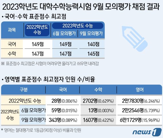 국어 영역은 표준점수 최고점이 140점으로, 지난해 수능(149점)과 6월 모의평가(149점)보다 9점 낮아진 것으로 나타났다.